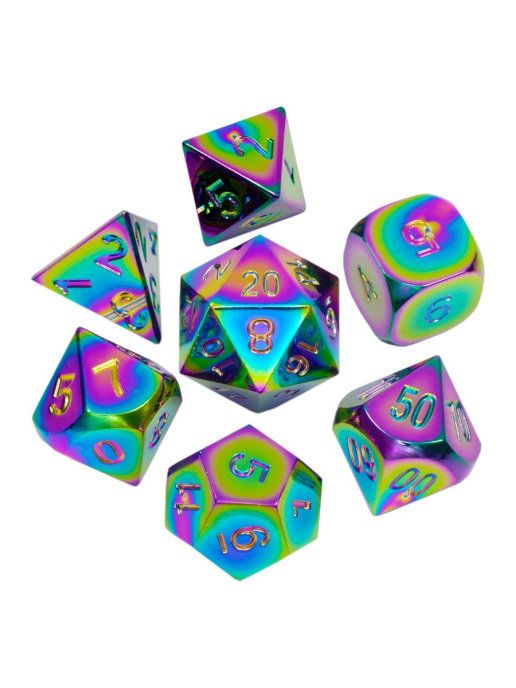 Набор дайсов с разным количеством граней, которые можно использовать в ролевых настольных играх. Идеально подходят для таких настольных игр, как MTG, для D&D (Dungeon and Dragons) и других настольных ролевых игр. Кубики упакованы в металлический кейс с ложементом, так что станут отличным подарком и вы можете не переживать за их сохранность, да и шуметь при перевозке они не будут.
