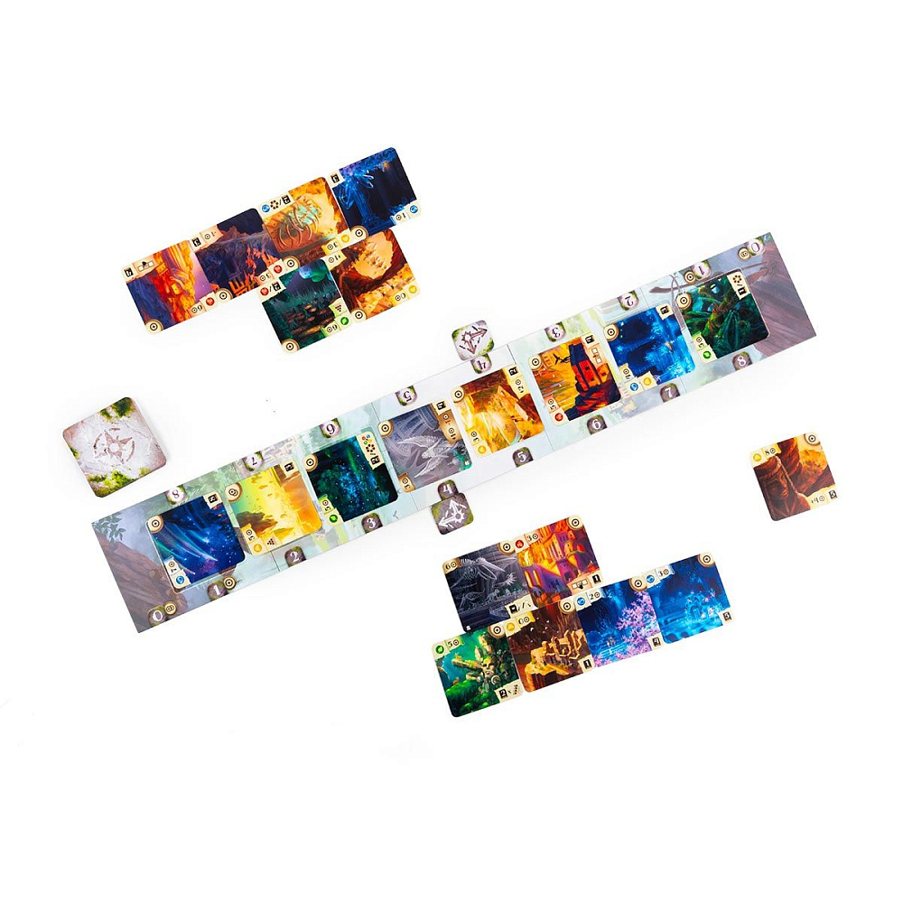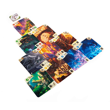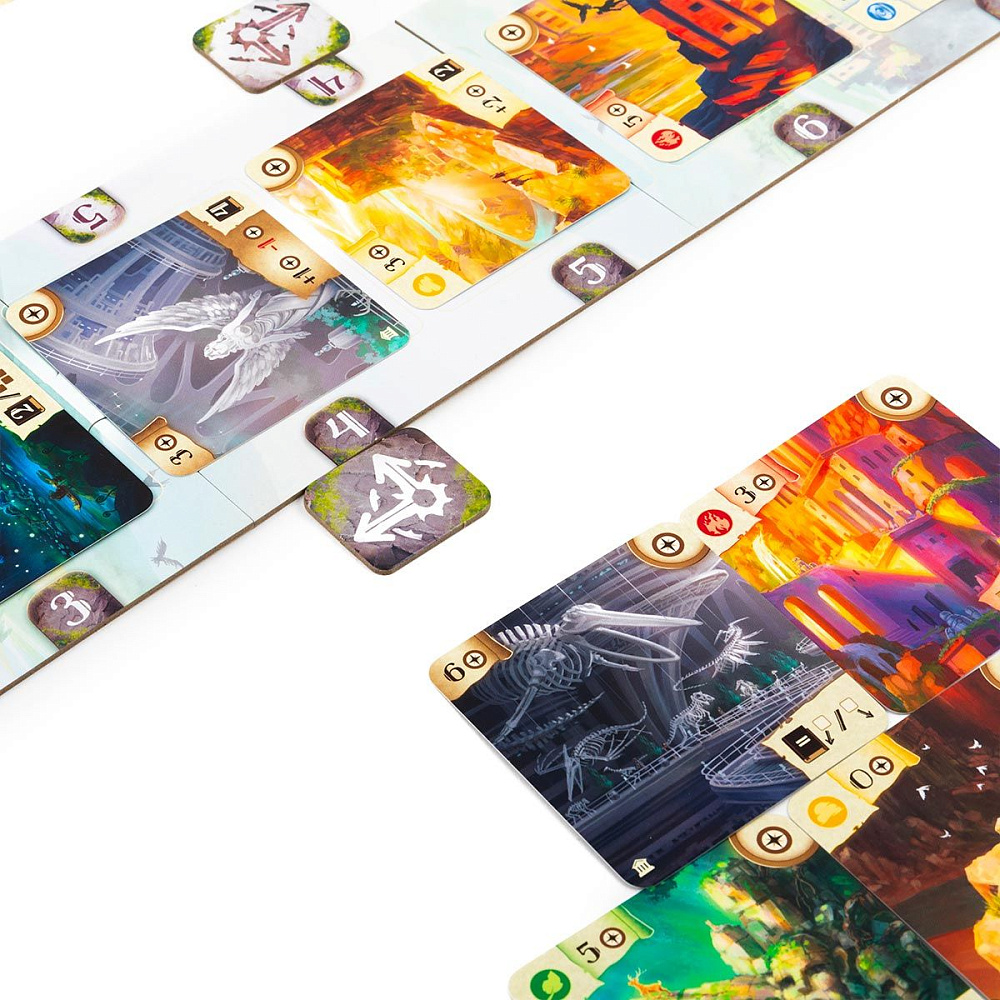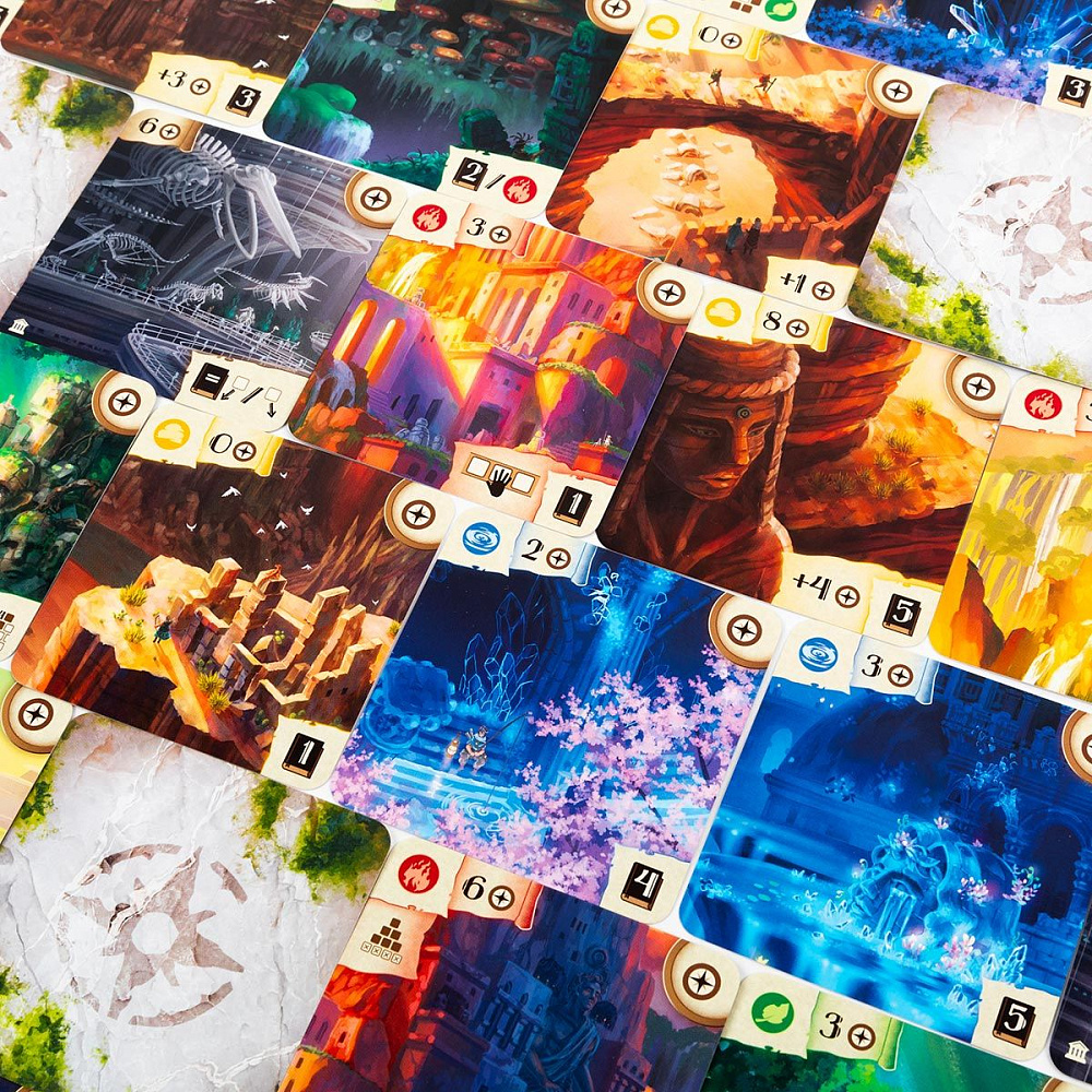Исследование: игрок выбирает на игровом поле доступную карту, стоимость которой не превышает количество доступных ему компасов – очков исследования, или берёт карту из своего резерва, оплачивает её стоимость и размещает карту в пирамиде, применяя эффект карты, если он есть. Эффекты некоторых карт активируются сразу после размещения и влияют на текущую игровую ситуацию: с их помощью, например, можно переместить карты в пирамиде, взять карту в резерв, получить компасы. Другие же эффекты активируются в конце игры и при выполнение определённых условий позволяют получить победные очки за карты в пирамиде игрока.
