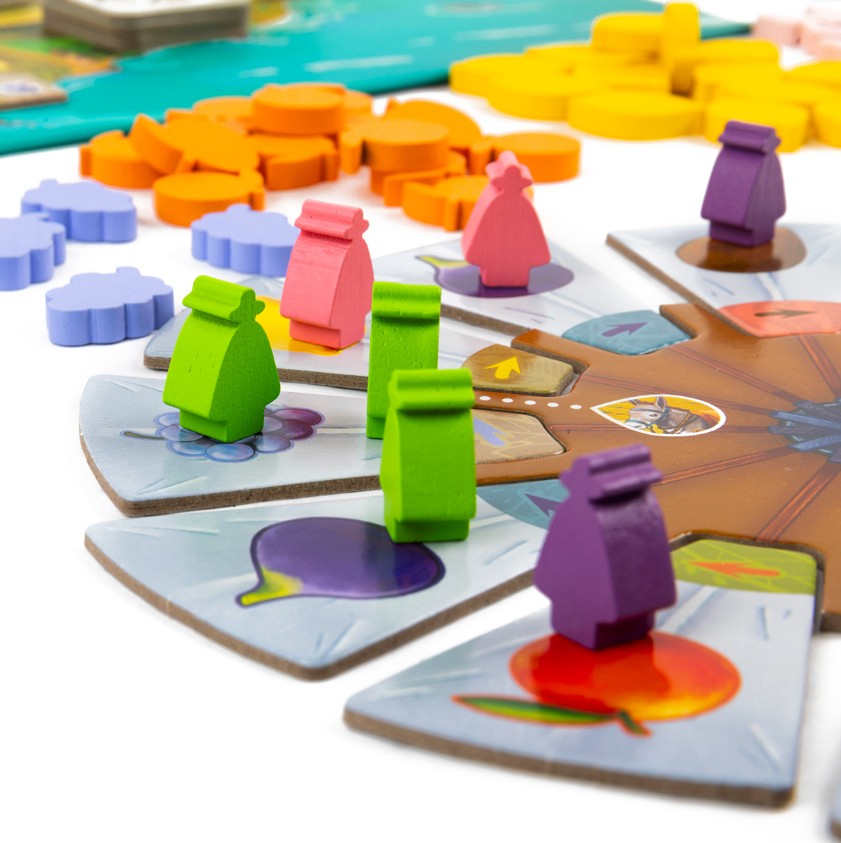 Передвигая фермеров по лопастям мельницы, вы можете получить фишки товаров и карты тележки. Игрок выбирает своего фермера и передвигает его по часовой стрелке на количество шагов, равное числу фермеров на лопасти мельницы, с которой началось передвижение. Когда фермер закончил передвижение, за каждого фермера, находящегося на лопасти, где он остановился, включая и его самого, игрок получает из общего запаса по 1 фишке товара изображенного на этой лопасти. А если фермер игрока пересекает пунктирную линию с символом ослика во время передвижения, то игрок получает карту тележки, которая понадобится для доставки товаров.