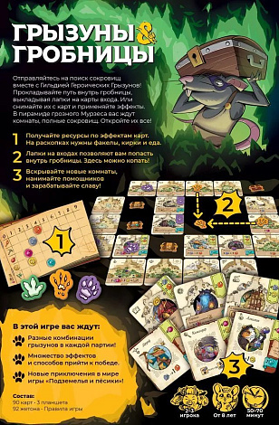 Грызуны и гробницы – настольная стратегическая игра от издательства Hobby World, переносящая вас в раскалённые пески древней пустыни, где под слоями камня и времени скрыта пирамида Мурзеса. В её глубинах покоятся несметные сокровища, но путь к ним открыт лишь самым хитрым и расчётливым членам Гильдии Героических Грызунов. Конкуренция здесь нешуточная: каждый стремится проложить собственный маршрут вглубь гробницы и вернуться с добычей раньше соперников.