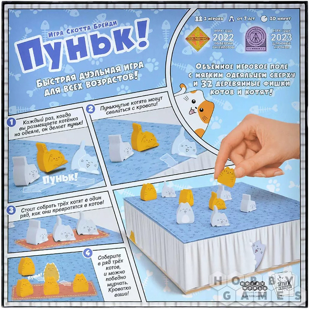 "Пуньк!" – это очаровательная дуэльная игра, которая покорит и детей, и взрослых. В коробке вас ждёт уютное игровое поле в виде стёганого одеяла и объёмные фигурки котят и котов. Главная цель – первым собрать ряд из трёх взрослых котов или разместить их всех ваших на мягком одеялке. Но будьте готовы к постоянным сдвигам и неожиданностям – каждый ход меняет расстановку сил! Игра сочетает простые правила с глубокой стратегией и дарит море веселья.