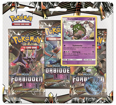 Комплектация коллекционной карточной игры Pokemon Sun & Moon Forbidden Light: Тройной блистер + Промо-карта Garbodor + Монета: