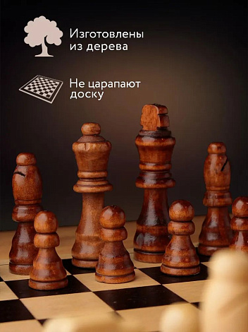 Шахматы не нуждаются в представлении – эта древняя стратегическая игра популярна и по сей день, будучи интеллектуальным видом спорта и обязательной настольной игрой в любом доме. Данный набор шахмат отлично подойдёт как начинающим игрокам, так и бывалым любителям противостояния чёрных и белых фигур. Фигуры выполнены из дерева, обладают хорошей детализацией и отлично смотрятся на доске.