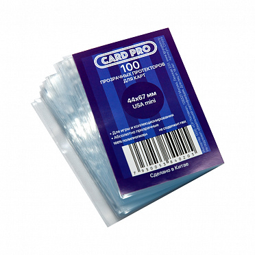 Упаковка из 100 прозрачных протекторов Card-Pro из тонкого полипропилена. Протекторы подходят для настольных игр с маленькими карточками, шириной 40-43 мм, например, таких как: Путешествие к Центру Земли, Талисман 4-я редакция, Ужас Аркхэма, World of Warcraft: Настольная игра, World of Warcraft: Мир Приключений, Черная овца, Twilight Imperium (3rd edition). Размер протекторов 44х67 мм.