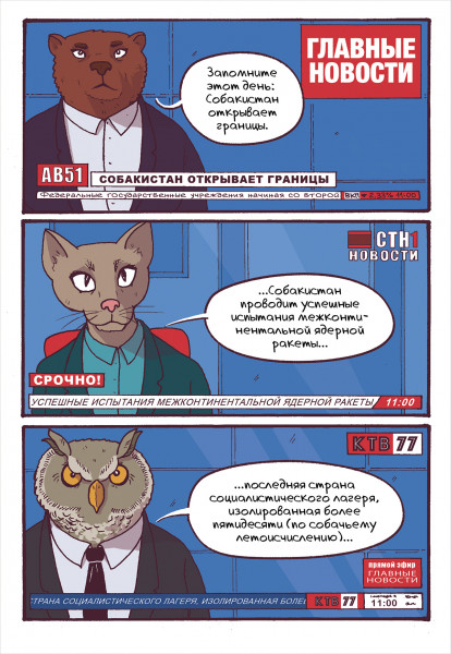 Закрытая социалистическая республика Собакистан открывает границы главам дружественных государств и избранным журналистам в честь репетиции похорон лидера республики – товарища Дружка. Что может пойти не так? Что угодно! Немного стилистики закрытых стран соцлагеря в восьмидесятые годы, немного антропоморфных животных, щепотка шпионских страстей, триллер по вкусу.