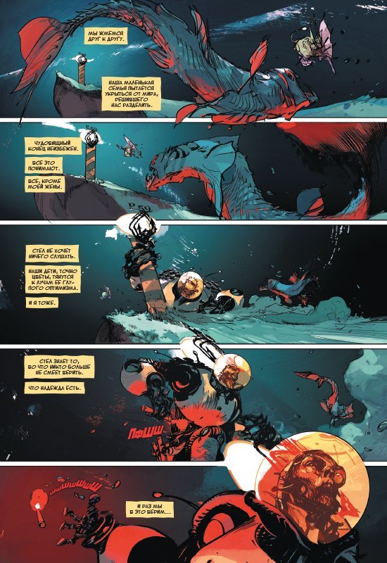 В далеком будущем увеличившееся Солнце отравило Землю радиацией, и люди перебрались на дно океана, спрятавшись там в закрытых куполами городах. Прошли тысячи лет. От разведывательных зондов, которые человечество когда-то посылало в космос в поисках пригодных для обитания миров, нет никаких вестей. Становится все сложнее добывать еду, а многократно переработанный воздух вот-вот станет слишком токсичным, чтобы поддерживать жизнь. Подводные города постепенно превращаются в гробницы для своих обитателей. Кажется, что все, что ждет остатки человечества – голод, болезни, преступления и гибель. И лишь женщина по имени Стел Кейн продолжает верить, что надежда есть… Сценарист Рик Ремендер (Black Science, Deadly Class) и художник Грег Токкини (Last Days of American Сrime, Uncanny X-Force) создали великолепную научно-фантастическую сказку о мрачном подводном мире и семье, которая пытается сохранить во тьме огонек надежды.