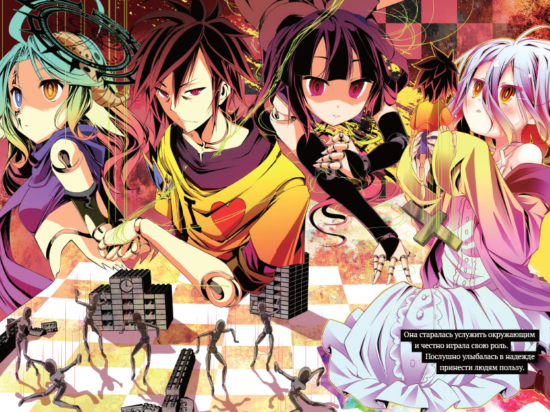 Сора и Сиро — брат и сестра. Они — хикикомори, нигде не работают и не учатся, но прославились на весь Интернет благодаря мастерству в играх. Попав в Дисборд — мир, где все решается при помощи игр, — они стали правителями человечества и задумали объединить все расы и бросить вызов Единому Богу. Так и не найдя способ выиграть в игре королевы сирен, брат с сестрой отправляются за информацией в город крылатых, Авант Хейм! Смогут ли они найти общий язык с расой, созданной для войны с самими богами? Предстоит покорить и море, и небеса, завоевав одним махом сразу три народа!