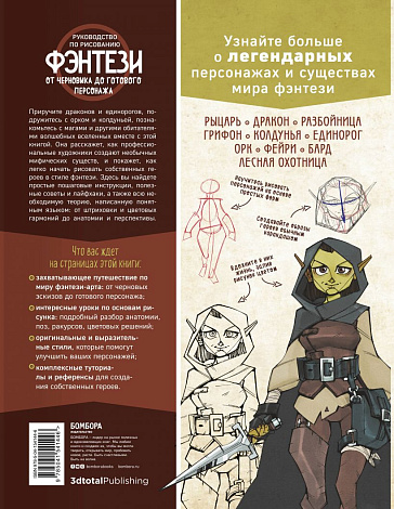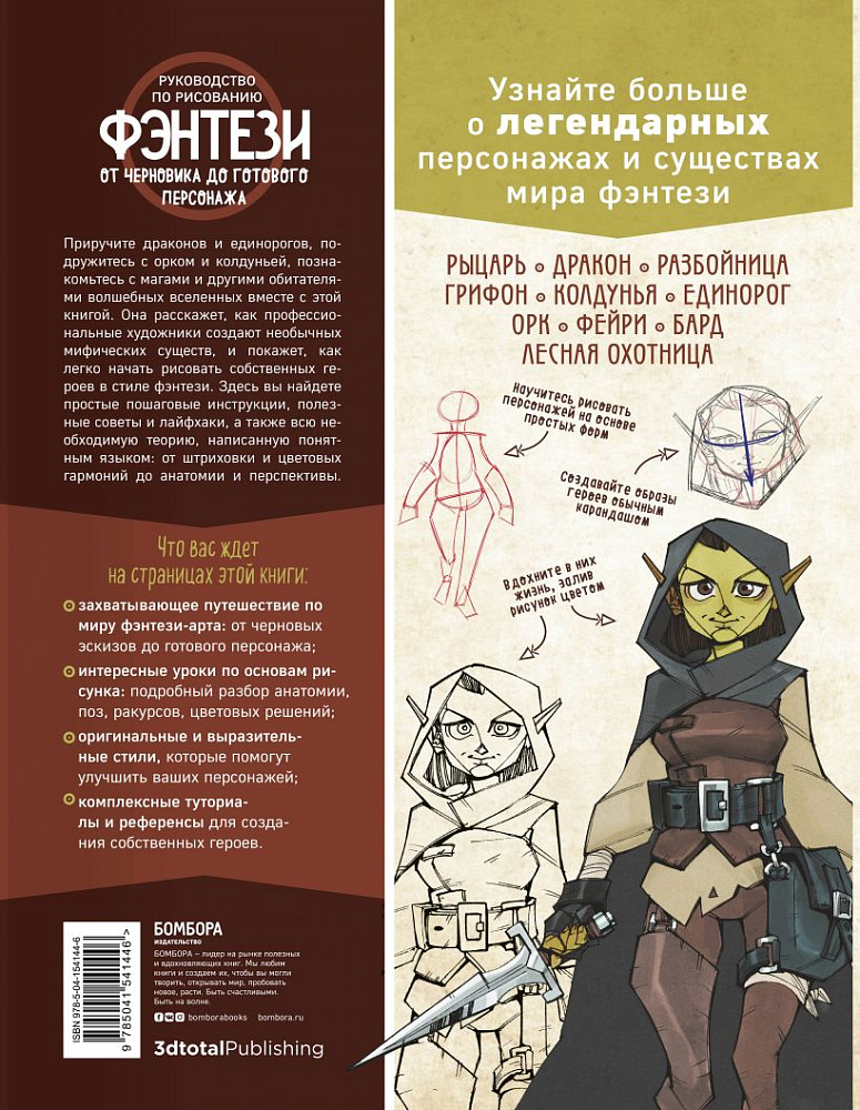 Подробный гайд от 11 профессиональных художников со всего мира, в котором они делятся секретами своего мастерства и раскрывают все тайны фэнтезийных персонажей. В нем собраны подробные туториалы, где художники покажут, как нарисовать орка, фейри, гриффона и других фантастических существ. Пособие расскажет, как из чернового наброска создать интересного и детализированного героя, почему важно правильно подбирать для него гармоничные цвета, позы и ракурсы и какую технику и материалы выбрать. Вместе с этой книгой вы изучите различные художественные техники, законы перспективы, анатомию и научитесь создавать своих фэнтези-персонажей.