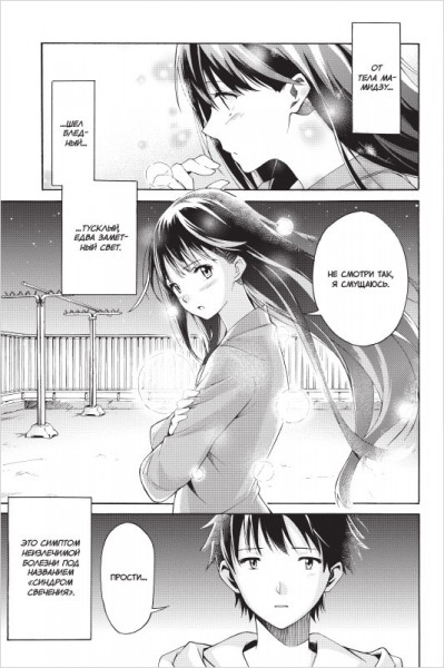Манга-версия трогательного романа-бестселлера! Старшекласснику Такуе, который винит себя в смерти сестры, поручают навестить одноклассницу Мамидзу Ватарасэ. Под светом луны тело девушки источает слабое сияние: это симптом неизлечимой болезни под названием «синдром свечения». Мамидзу знает, что жить ей осталось недолго, и рассказывает Такуе о своем списке желаний, которые она хотела бы осуществить перед смертью...