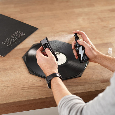 Набор предназначен для экспресс-очистки поверхности грампластинки. Нанесите антистатик на подушку щётки и протрите поверхность винила. Бесспиртовой состав уверенно снимет жирные пятна, пыль, вернёт пластинке чёрный глянец. Позволяет добиваться длительного антистатичекого эффекта. Нож Sax имеет короткое лезвие специальной формы. Не повредит пластинку и вложения во время вскрытия запечатанного альбома. Складной, карманный.