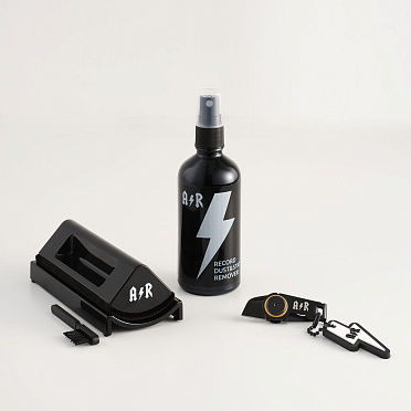 Состав набора: Спрей антистатический Record Dust&Stat Remover 100 мл в чёрном стеклянном флаконе, велюровая щётка, мини-щётка, нож Sax для вскрытия фабричной плёнки грампластинки.