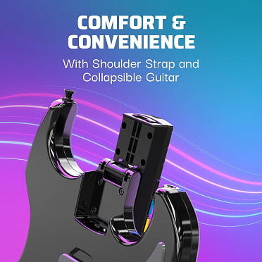 Встроенный аналоговый стик (patent pending), плечевой ремень для удобной игры и складная конструкция для компактного хранения и транспортировки.