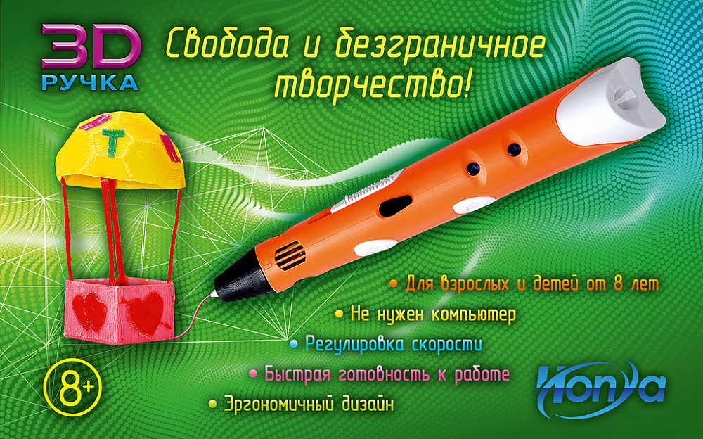 3D-ручка HONYA – это возможность воплотить все творческие идеи в объемных изделиях, полная свобода творчества! Корпус ручки выполнен из прочного пластика с вставками из белого пластика для разграничения областей и элементов управления, что повышает удобство использования. С помощью 3D-ручки HONYA вы сможете заниматься моделированием, созданием различных объемных картин, предметов, а также создавать абстрактные фигуры. При необходимости возможна замена сопла ручки. Рабочим материалом выступает ABS пластик. Сопло толщиной всего в 0,7 мм позволит создавать действительно точные работы. Эргономичный дизайн, регулируемая скорость подачи пластика, легкая замена материала печати – все это сделает использование ручки приятным и продуктивным!