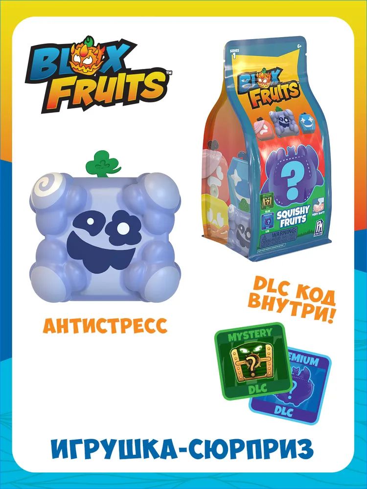 Игрушка‑антистресс Series 1 в виде фрукта Blox Fruits поставляется с игровым кодом внутри. Пакет‑сюрприз: только открыв его, можно узнать, какой мистический фрукт внутри! В набор входит специальный игровой код DLC, который можно использовать для получения дополнительных преимуществ в Roblox. Это особый пароль, который также является подарком‑сюрпризом. Практически в каждой упаковке можно найти DLC‑код Mystery. Вероятность найти DLC‑код Mystery – 19/20. Везунчикам может попасться упаковка с DLC‑кодом Premium. Вероятность найти DLC‑код Premium – 1/20.
