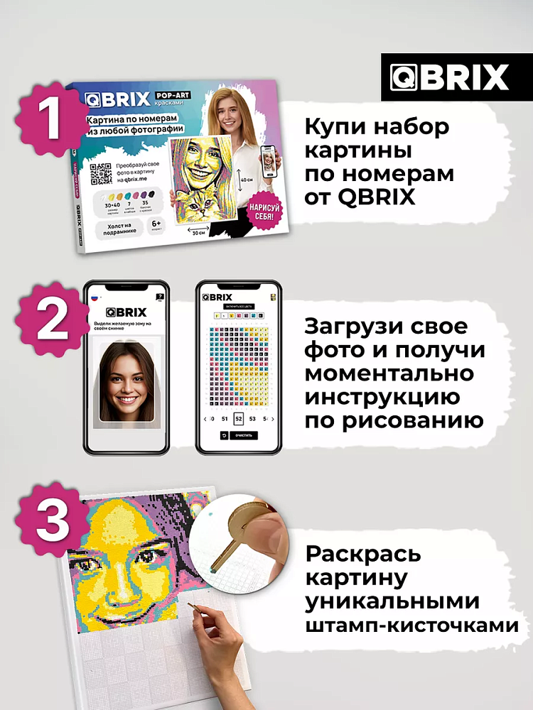 Большая картина по номерам на холсте на подрамнике из любой фотографии от QBRIX предоставит вам возможность своими руками нарисовать любое выбранное фото. Творческое занятие, которое затянет не на один вечер! Наборы представлены в трех цветовых палитрах: VINTAGE, ORIGINAL и POP-ART.