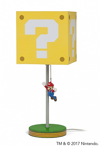 Лампа выполнена в форме классического блока "?" из Super Mario и включается при помощи цепочки, на конце которой застывший в прыжке Марио. Комплект поставки: абажур из ткани, основание лампы, цепочка с Марио (не снимается). Лампочка в комплект не входит. Рекомендация по лампочке - 40 ВТ (тип энергопотребления А), цоколь Е27. Высота 48,3 см, диаметр основания 14,8 см. Работа от usb кабеля - нет. Эта лампа официально лицензирована Nintendo. Состав: металл, пластик, текстиль.