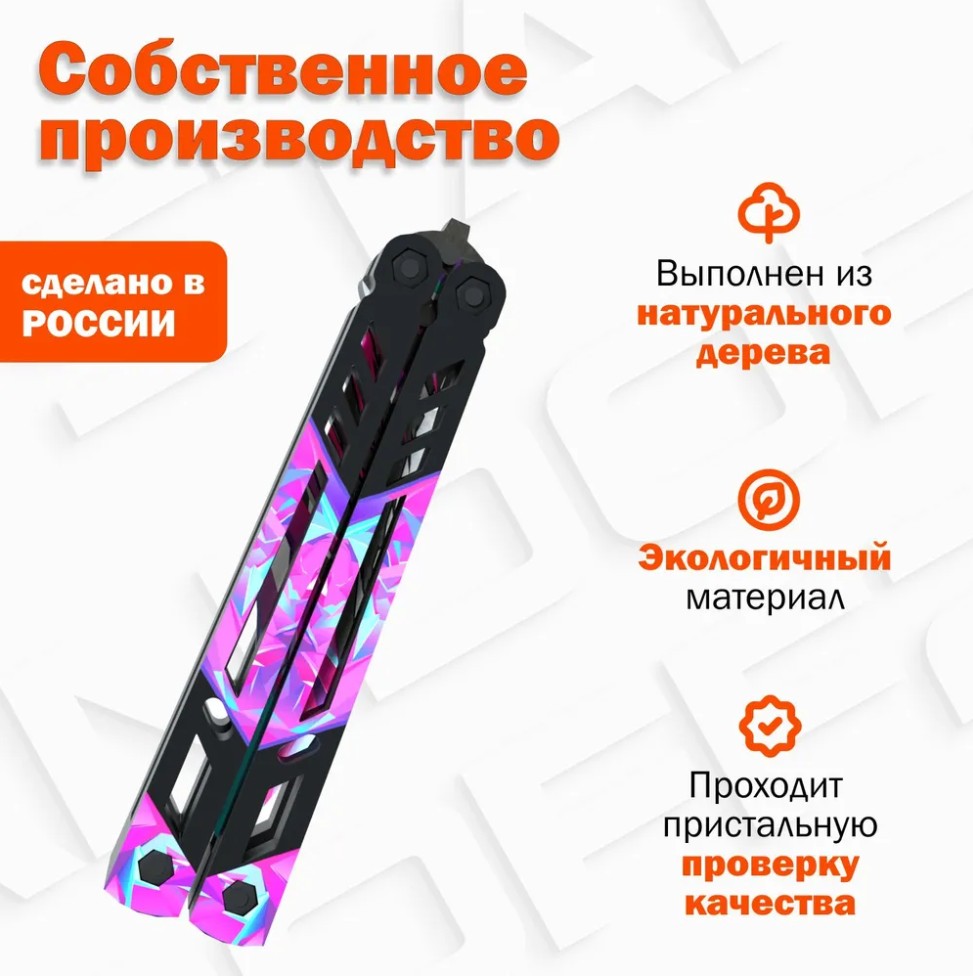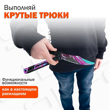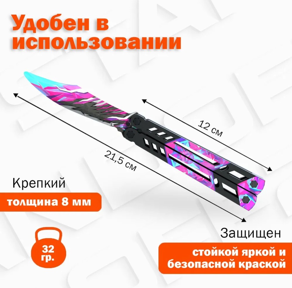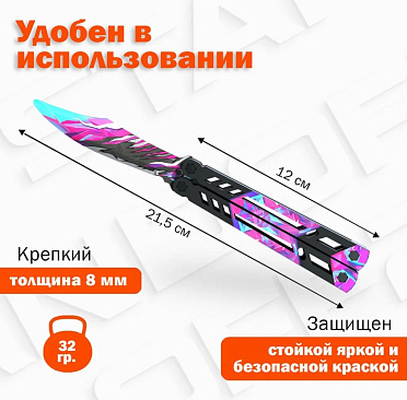 Нож-бабочка из культовой компьютерной игры порадует поклонников своим высоким качеством и яркими скинами. В нашем каталоге фанаты могут приобрести 3D модель для упражнения в трюках. Нож бабочка в скине Генезис положит начало коллекции игрового оружия или будет дополнением к уже существующей. Нож отличается ПРОСТОТОЙ ИСПОЛЬЗОВАНИЯ. Его легко РАЗЛОЖИТЬ и СЛОЖИТЬ одним движением, а плавность хода лезвия РЕГУЛИРУЕТСЯ натяжением болтов.