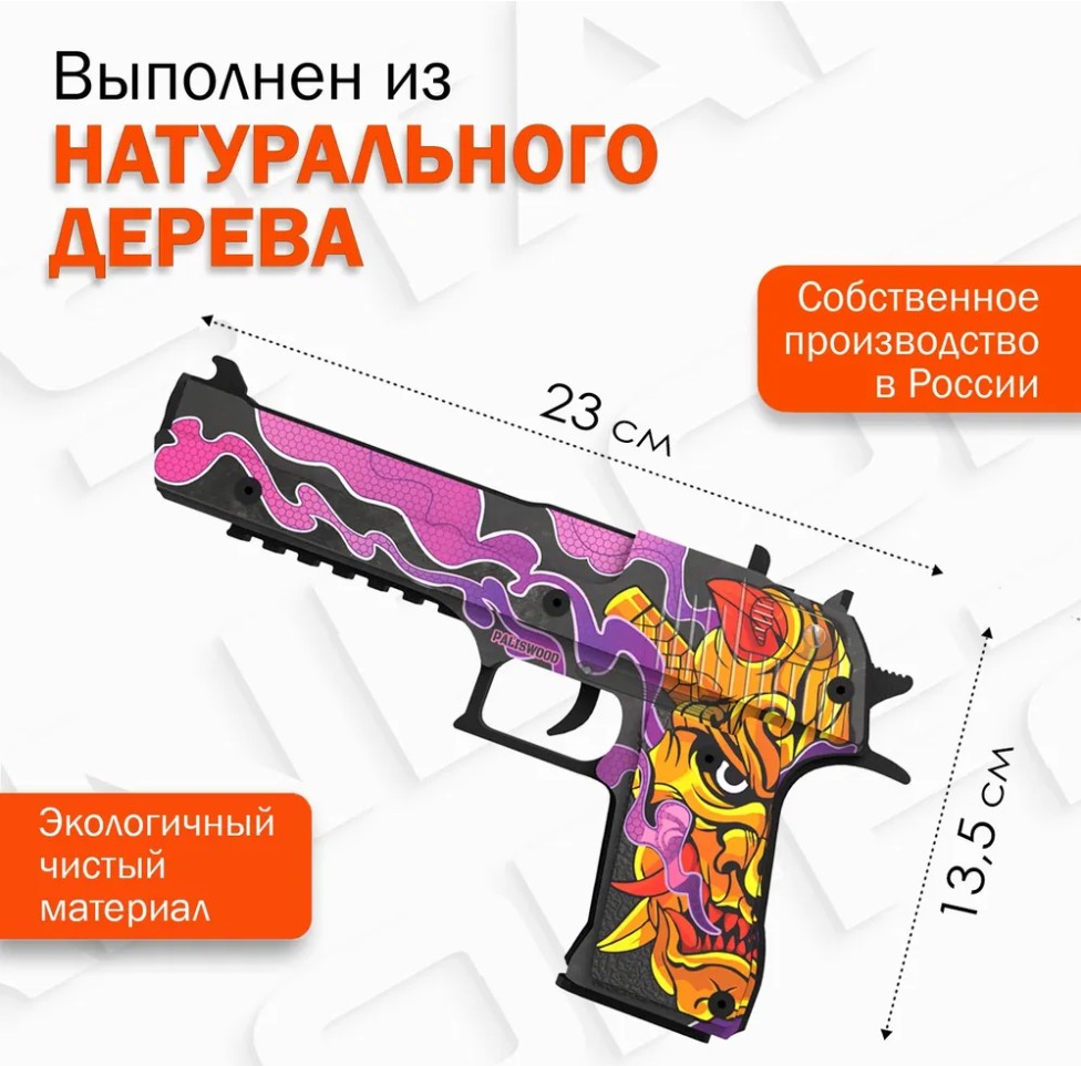 Воплощая лучшие черты легендарных скинов из игры, игрушка поражает стильным внешним видом. Такой пистолет станет не только захватывающей игрушкой, но и украшением коллекции фанатов. Изделие выполнено из дерева высокого качества — PalisWood гарантирует прочность и безопасность использования. Деревянные элементы приятны на ощупь и отлично подходят для активных игр.