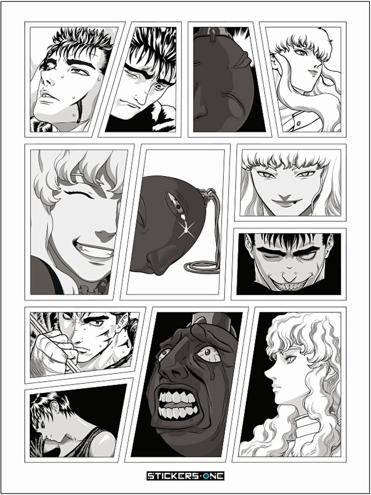 Набор контурных стикеров на листе Berserk Manga. Ширина стикера 4-5 см. Формат листа 150х210 мм. Материал, используемый для изготовления стикеров – атмосферостойкий винил. Стикеры (контурные наклейки) идеально подходят для гладких поверхностей, таких как ноутбуки, планшеты и др. Легко удаляются, не оставляют следов клея.