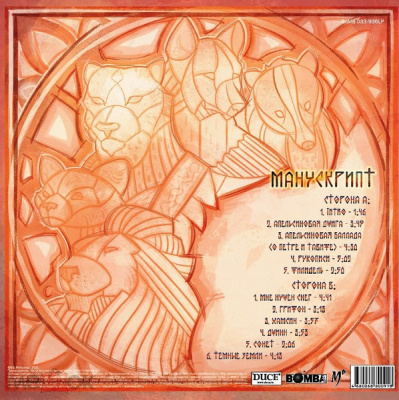 Мельница – Манускрипт – издание на черном виниле студийного альбома 2021 года от коллектива Мельница. Альбом был записан в кратчайшие сроки за 8 «студийных» дней в традиционном составе с участием струнного квартета и Хелависы, аккомпанимирующей на фортепиано.