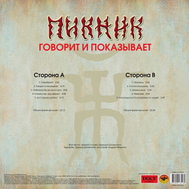 Пикник – Говорит и показывает. Coloured Gold Vinyl (LP) – издание на цветном 180-граммовом золотом виниле тринадцатого студийного альбома от отечественной рок-группы «Пикник», выпущенного в 2003 году.