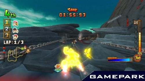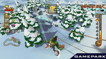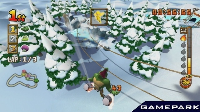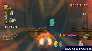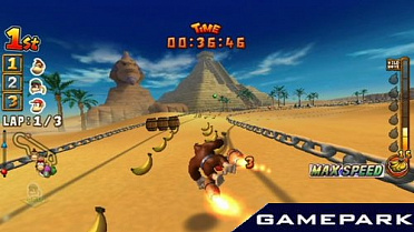 Донки Конг - обезьяна в галстуке, противник Марио и похититель женщин - весьма многогранный персонаж! Он король джунглей, вождь племени горилл и мартышек, в котором всеобщее увлечение - гонки. Обезьяны и их недруги крокодилы не ездят - они летают, приторочив к себе реактивные двигатели! Трассы пролегают по джунглям, над вулканами и даже под водой (осторожно, акулы!), а противников можно не только обгонять и подрезать - скосите их из пушки, стреляющей ананасами! Подбирайте ускорители и взмывайте высоко над трассой - совсем как в первом эпизоде «Звездных войн». Да пребудет с вами Сила… да помогут вам Бананы!